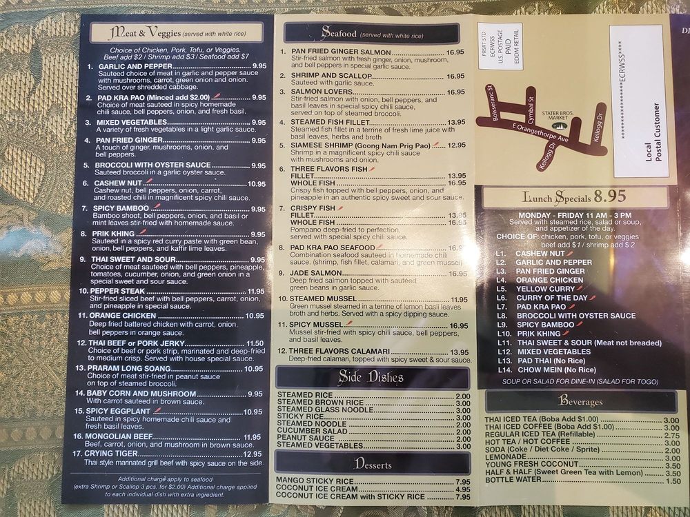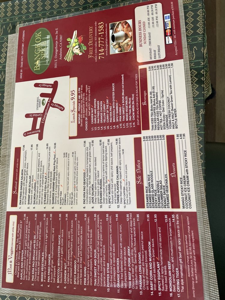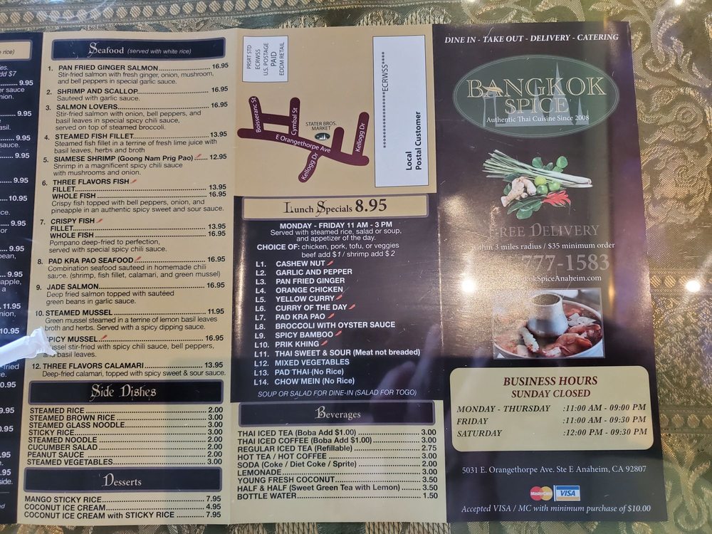 Welcome to Bangkok Spice Thai Cuisine, your go-to destination for authentic Thai flavors in Anaheim. This casual, Asian fusion eatery specializes in a delightful array of seafood dishes, nourishing curries, and vibrant noodles. From the famed Yellow Curry, mildly spicy and slightly sweet, to the aromatic Pad Thai, every plate is expertly crafted to ignite your palate.